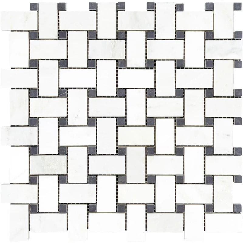 Asian Statuary (Oriental White) Marble Basketveawe w/Blue Dots Honed Mosaic